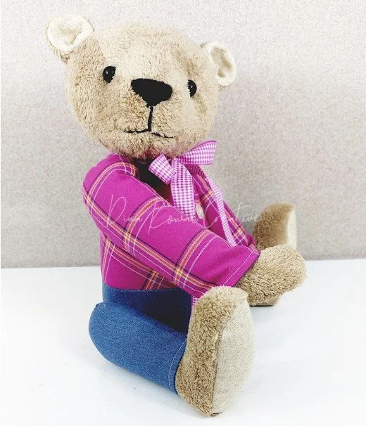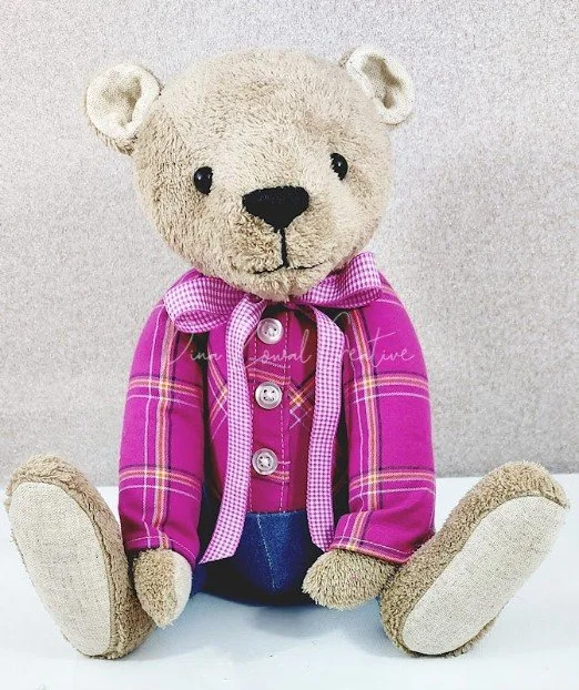 Plush bear (upcycled materials will be used at this cost) with outfit made from clothing you supply (outfit will not be removable): $118